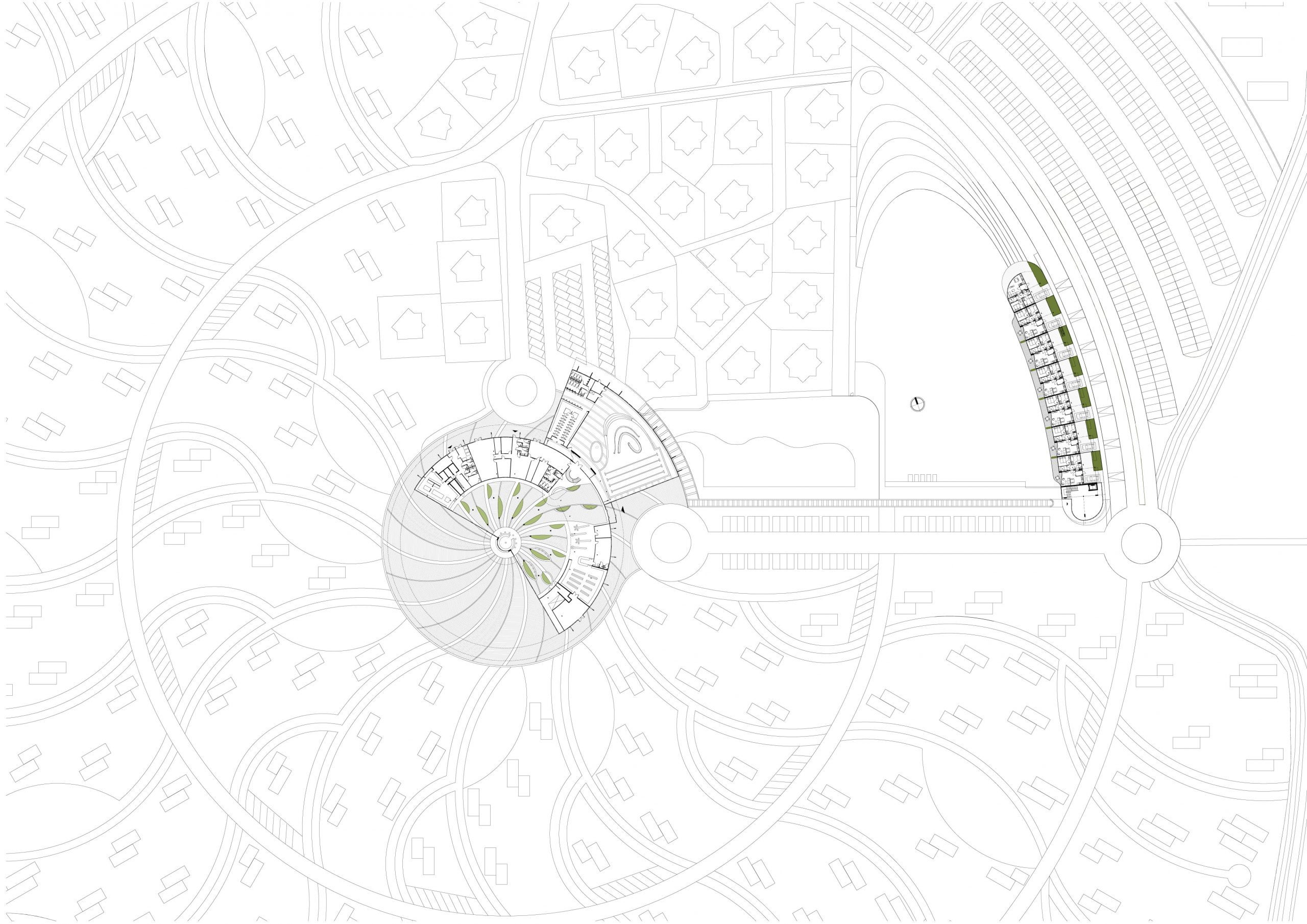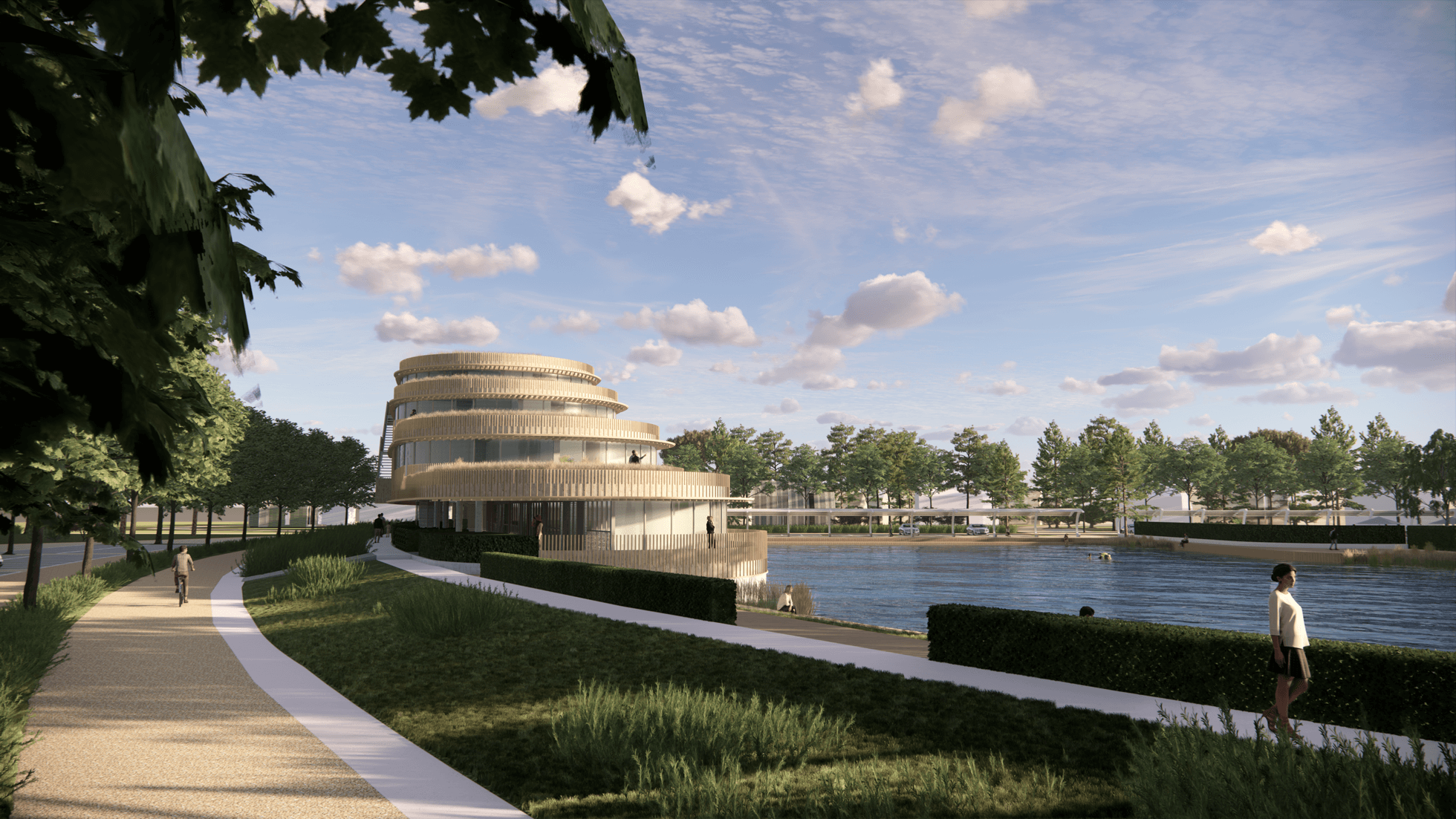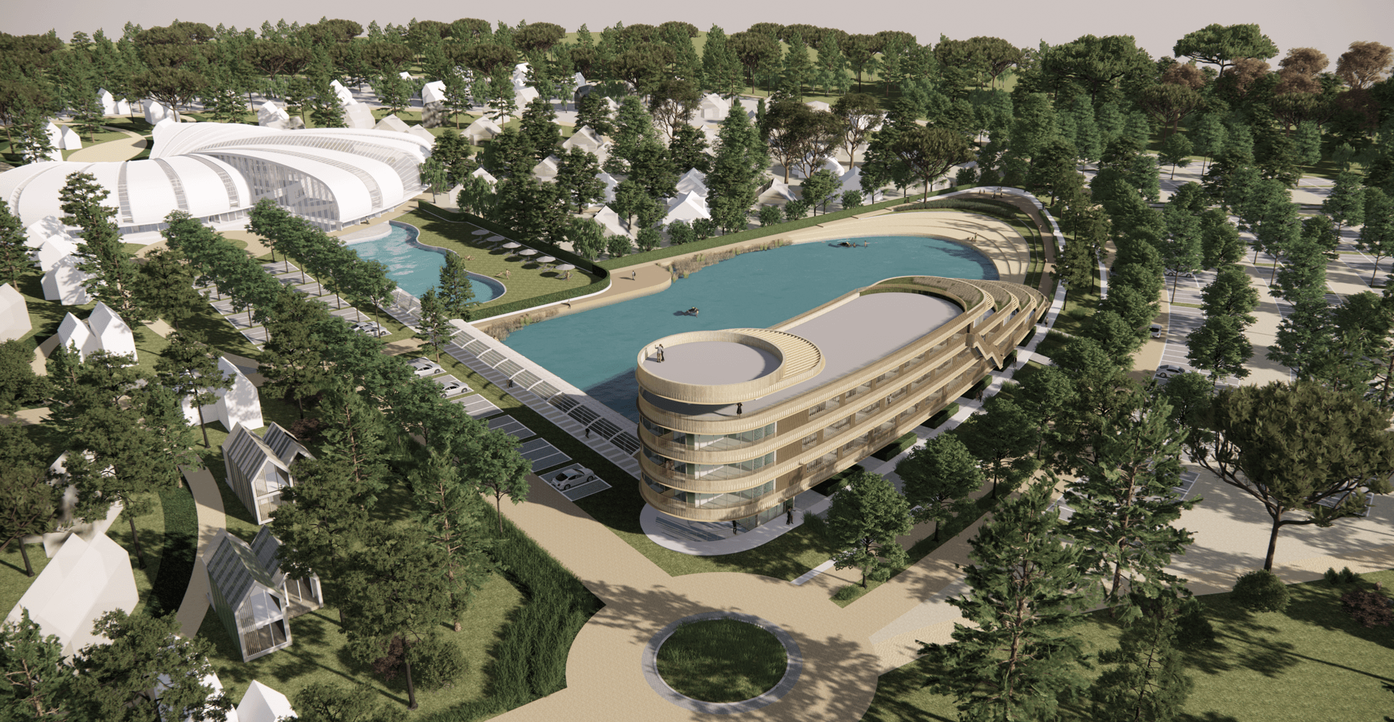 The building’s curvilinear form is its most striking feature, softening its overall impact and allowing it to blend into the landscape. The use of wood-like materials enhances the connection to nature, providing a warm, earthy aesthetic that complements the surrounding greenery. Glass railings on the terraces maintain unobstructed views, reinforcing the indoor-outdoor living experience. The building is carefully integrated into a masterplan focused on green spaces and water features, positioned prominently by the water, establishing it as a central feature of the development. Landscaped pathways and communal spaces enhance the connection between the building and nature, promoting pedestrian and cyclist access.