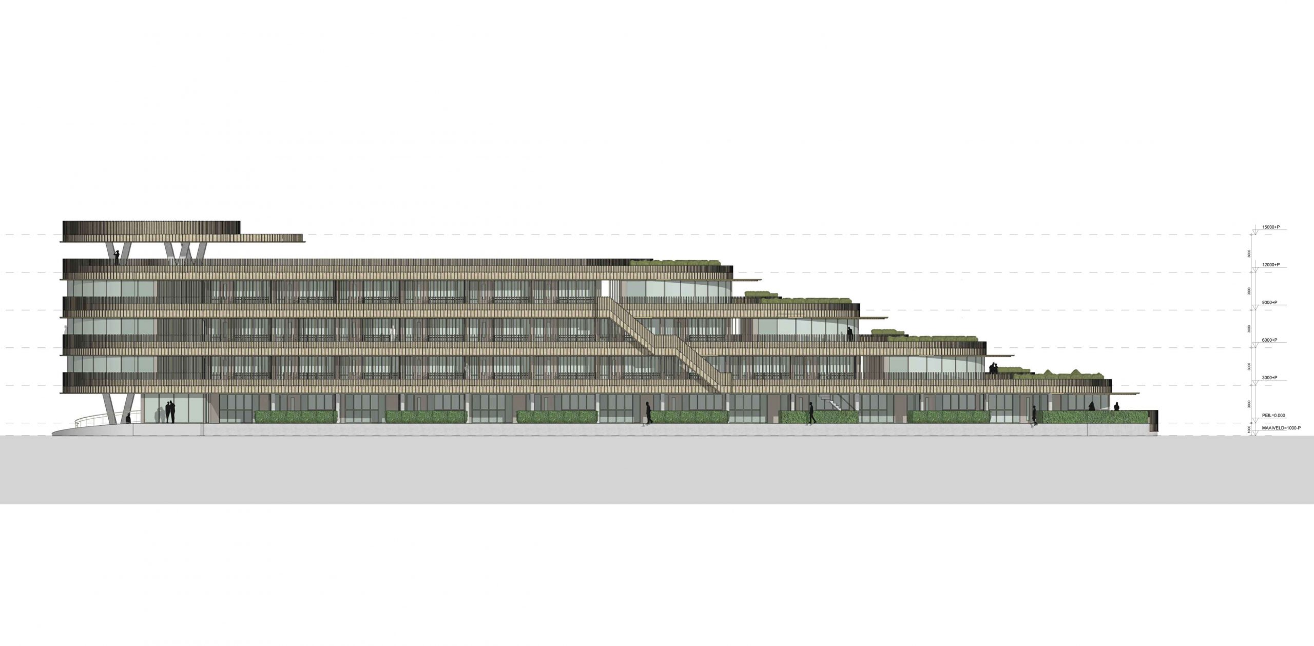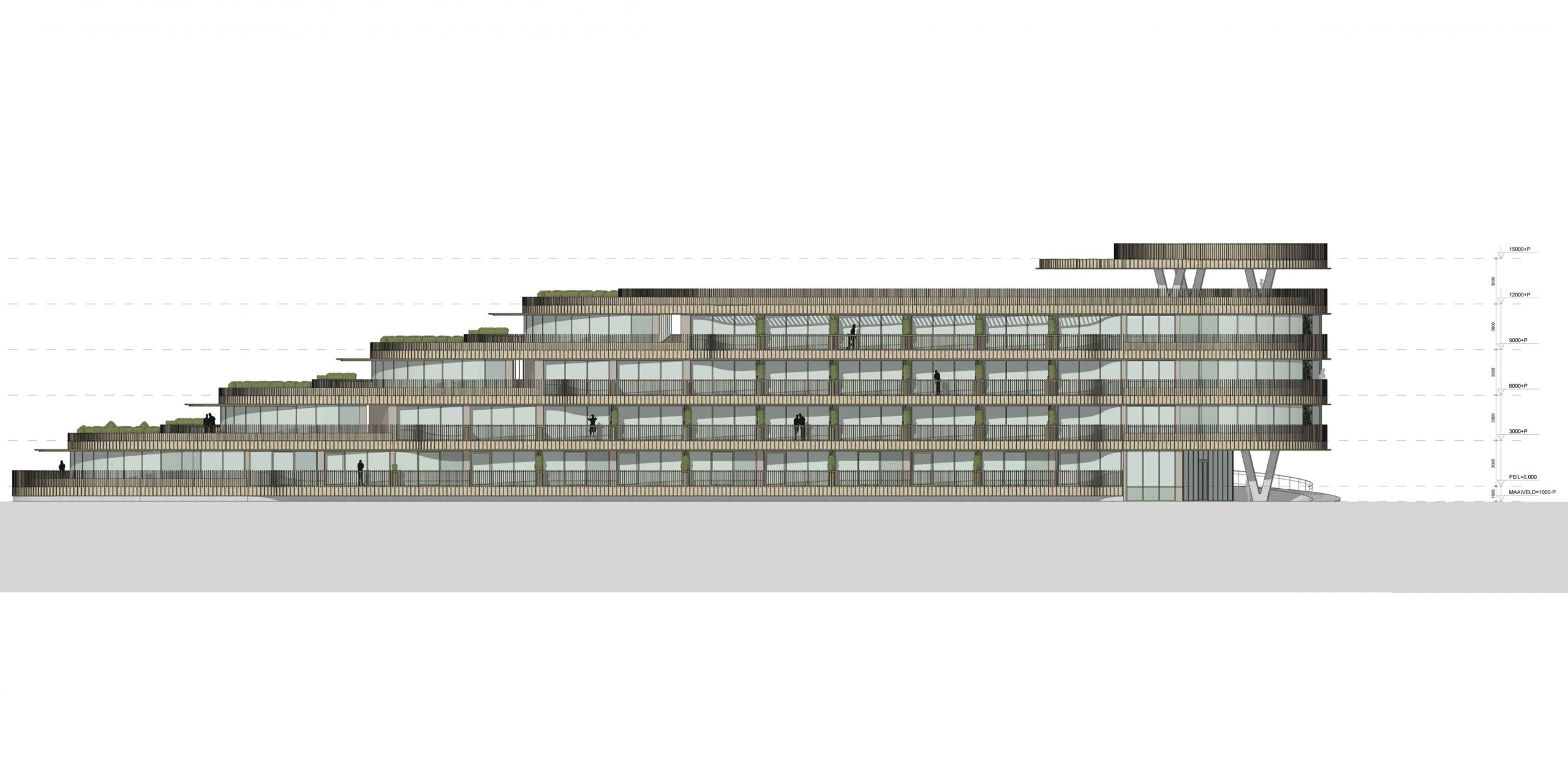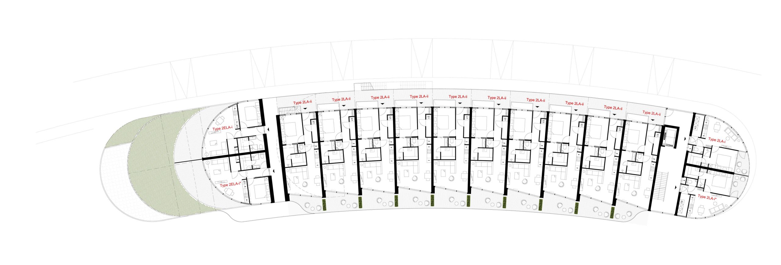 The apartment building in Forest Village Bergeijk, is designed with a terraced structure that harmonizes with its natural surroundings while offering functional, well-organized living spaces. The building’s layout features a multi-level design where each floor recedes from the one below, creating generous terraces for each apartment, ensuring expansive outdoor spaces ideal for relaxation. Living areas are placed along the curved outer edges, facing the water to take advantage of stunning views and natural light, while bedrooms and private areas are arranged inwards to enhance privacy. Circulation spaces are centrally located, allowing easy access to all units while minimizing disruption to private areas, achieving a balance between openness and privacy.