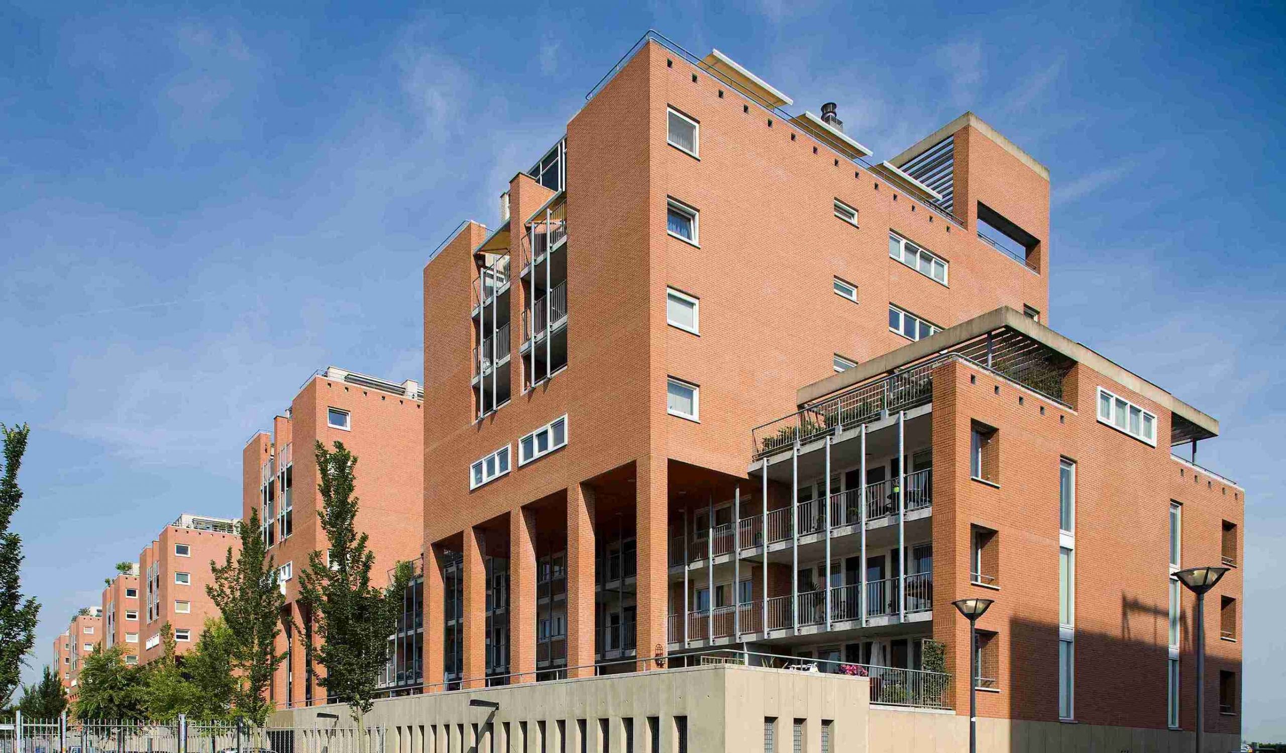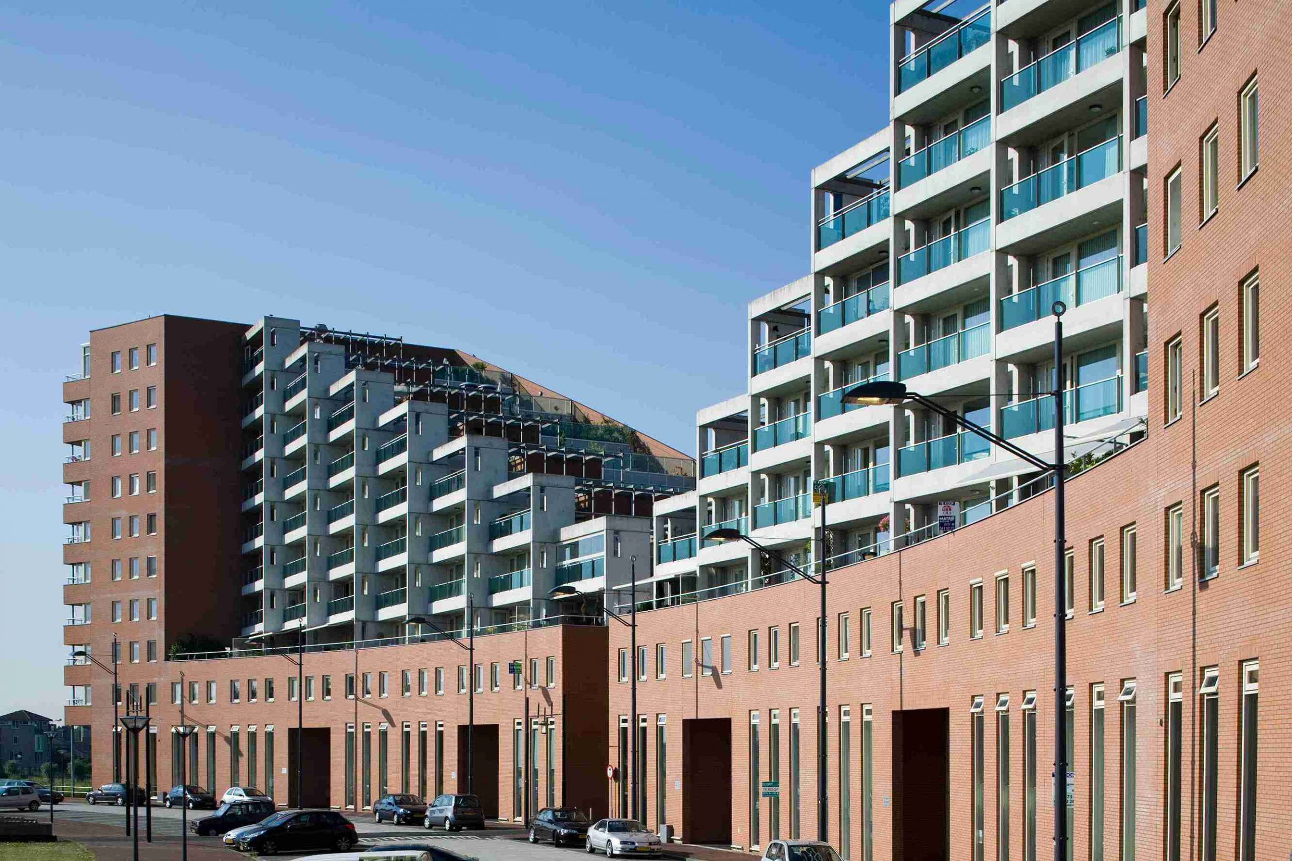Architecturally, De Boog is defined by its symmetry and rhythm, balanced with touches of intentional asymmetry to create a sense of movement and visual interest. The central curved building is split into two mirrored, symmetrical sections divided by a main axis—a guiding line that enhances the building’s sense of balance. The only departure from this symmetry is the tower element on the Maasboulevard, which introduces a playful, asymmetrical accent. The supporting apartment buildings are arranged as twin pairs, each consisting of two towers set on a shared base, creating a harmonious rhythm along the riverfront. These twin structures are aligned in a row, facing the water to capture the view and reinforce the riverside atmosphere of the site. The lower four floors of these towers connect smoothly with a series of three-story houses nearby, establishing a cohesive architectural flow that ties the entire neighborhood together.