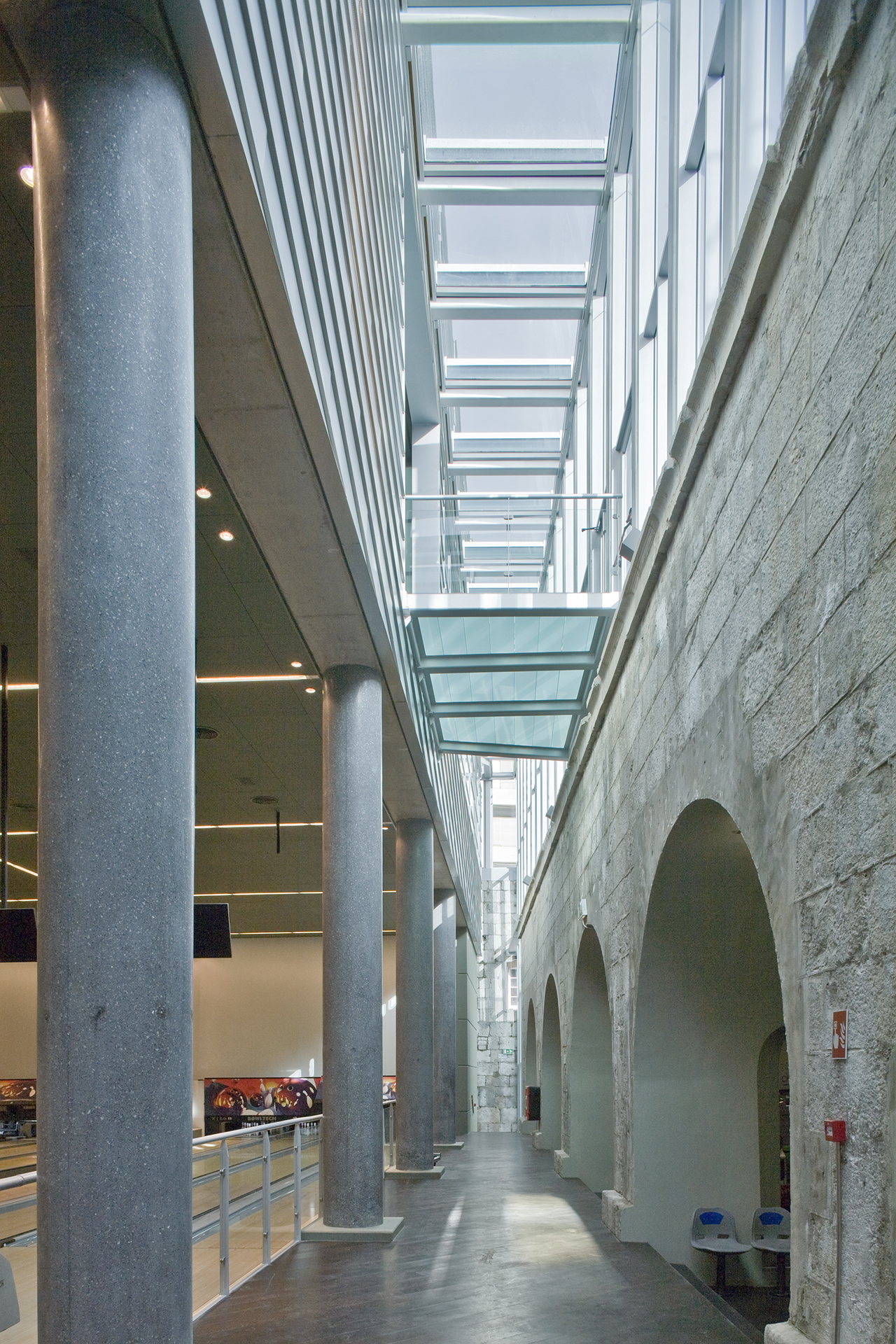 One of the key features of the design is the glass orangery, a transparent structure that connects the old and new parts. It allows daylight to flood into the space, illuminating the stone walls of the bastion and enhancing the overall atmosphere. The King’s Bastion now serves as a leisure center with various entertainment facilities, including two cinemas and an ice skating rink inside the silver box. The courtyard houses a bowling center, while additional amenities such as a nightclub, restaurant, and café are located on the ground and first floor of the bastion.