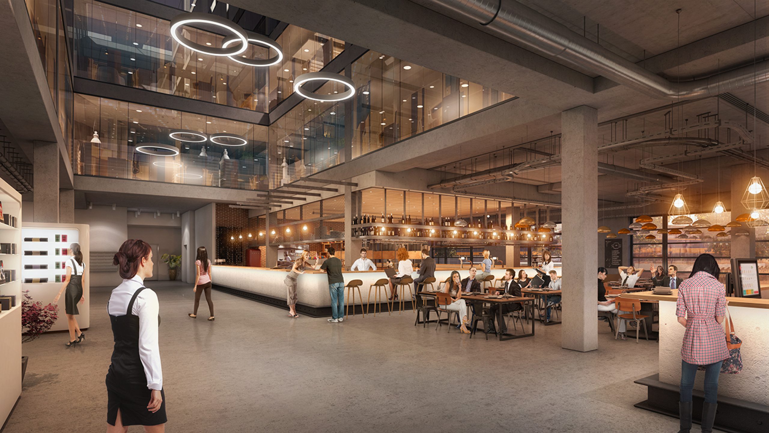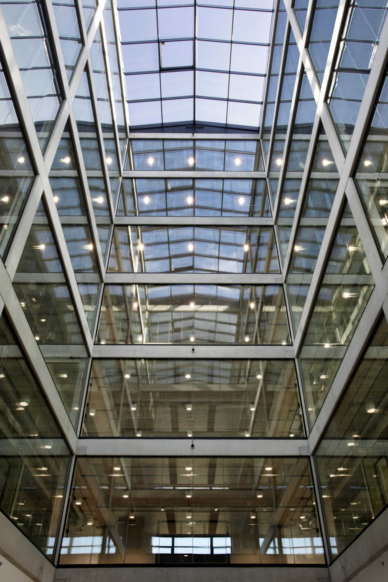 The lower two floors feature traditional masonry, with deeply recessed windows and two-story high openings that form an arcade-like base. This design enhances the accessibility and openness of the ground floor, which houses lively cafés and restaurants. Inside, a captivating seven-story atrium runs through the core of the building, acting as a lightwell that fills the interior with daylight, like a beacon guiding visitors into its heart.