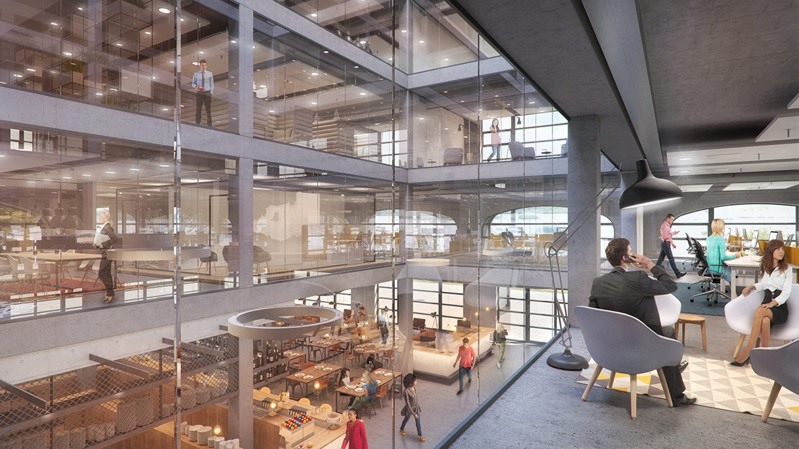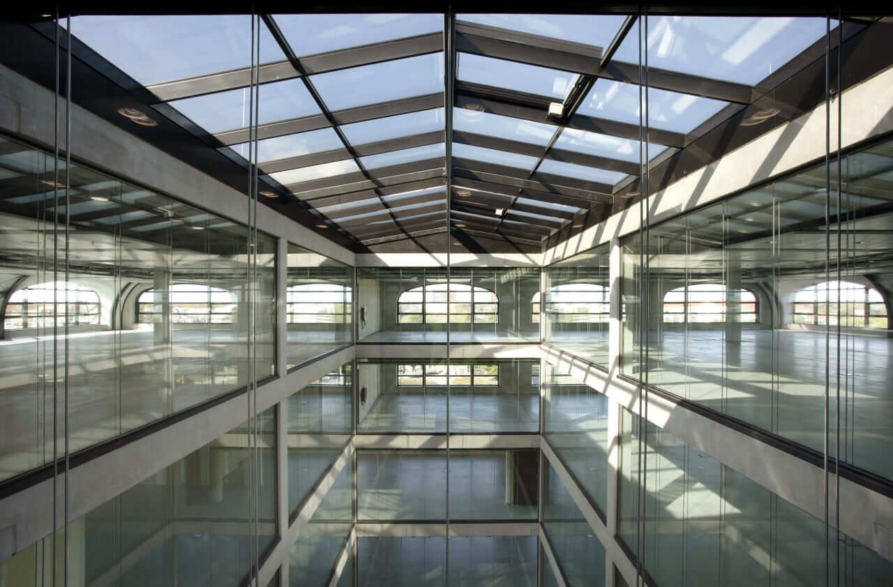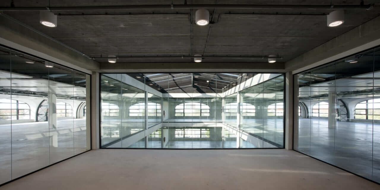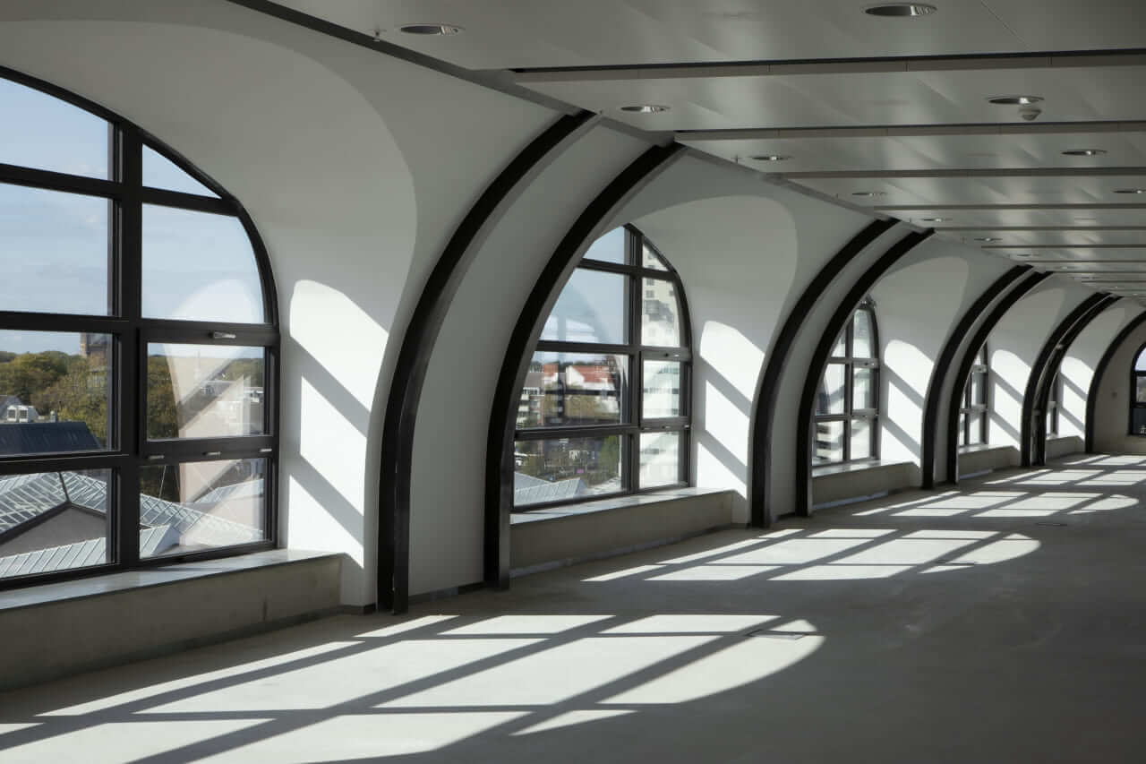 Plan T is fully electric and proudly holds a BREEAM “Very Good” certification, achieved in part through innovative floating climate ceilings. These ceilings leave elements of the building’s structure and piping visible, amplifying the raw industrial aesthetic. The building’s curved arches also evoke the “Plan T” train sets that were designed and built on this very site in the 1960s, a nostalgic nod to the trains that shaped the image of the Dutch Railways for decades.