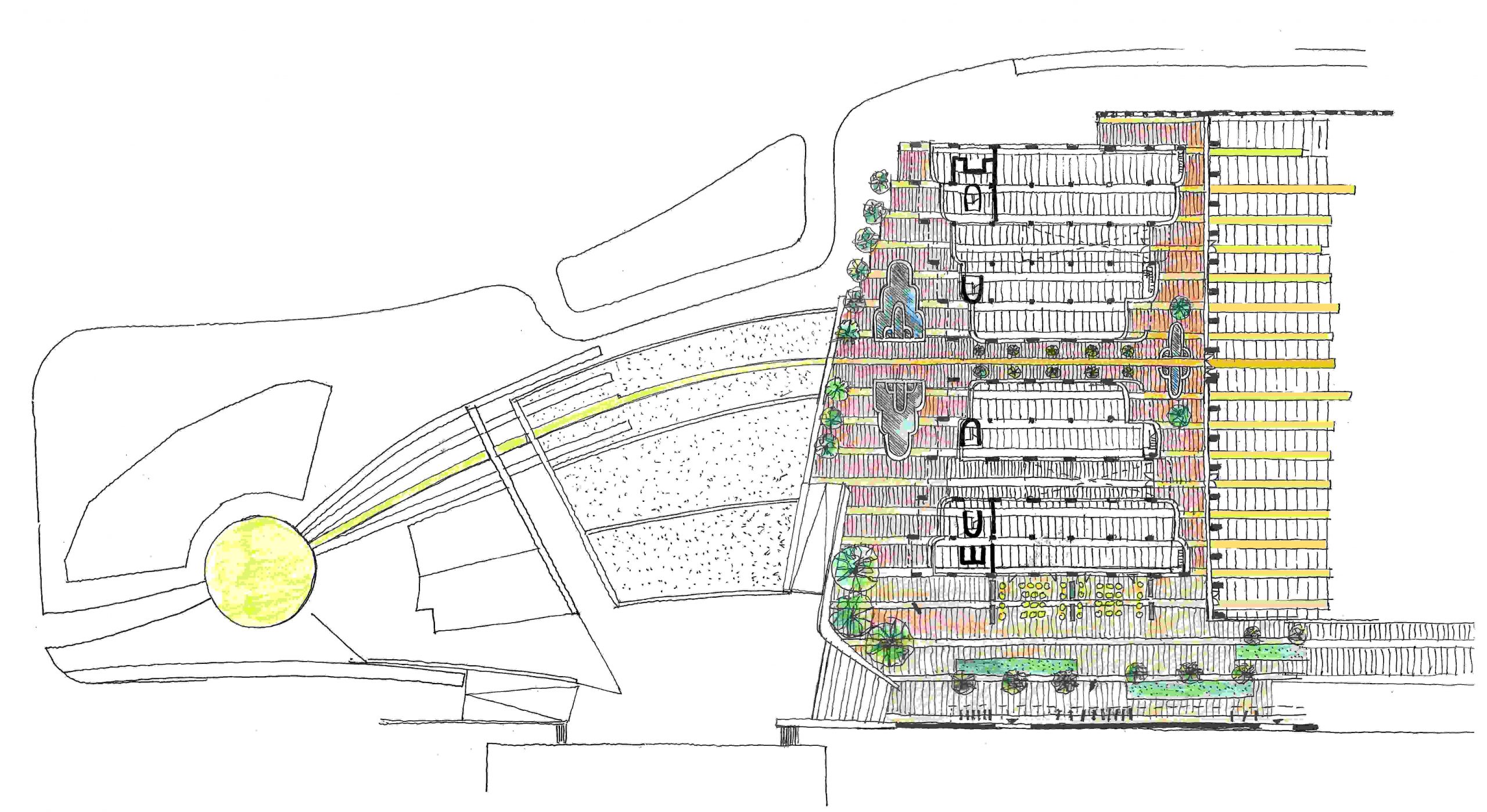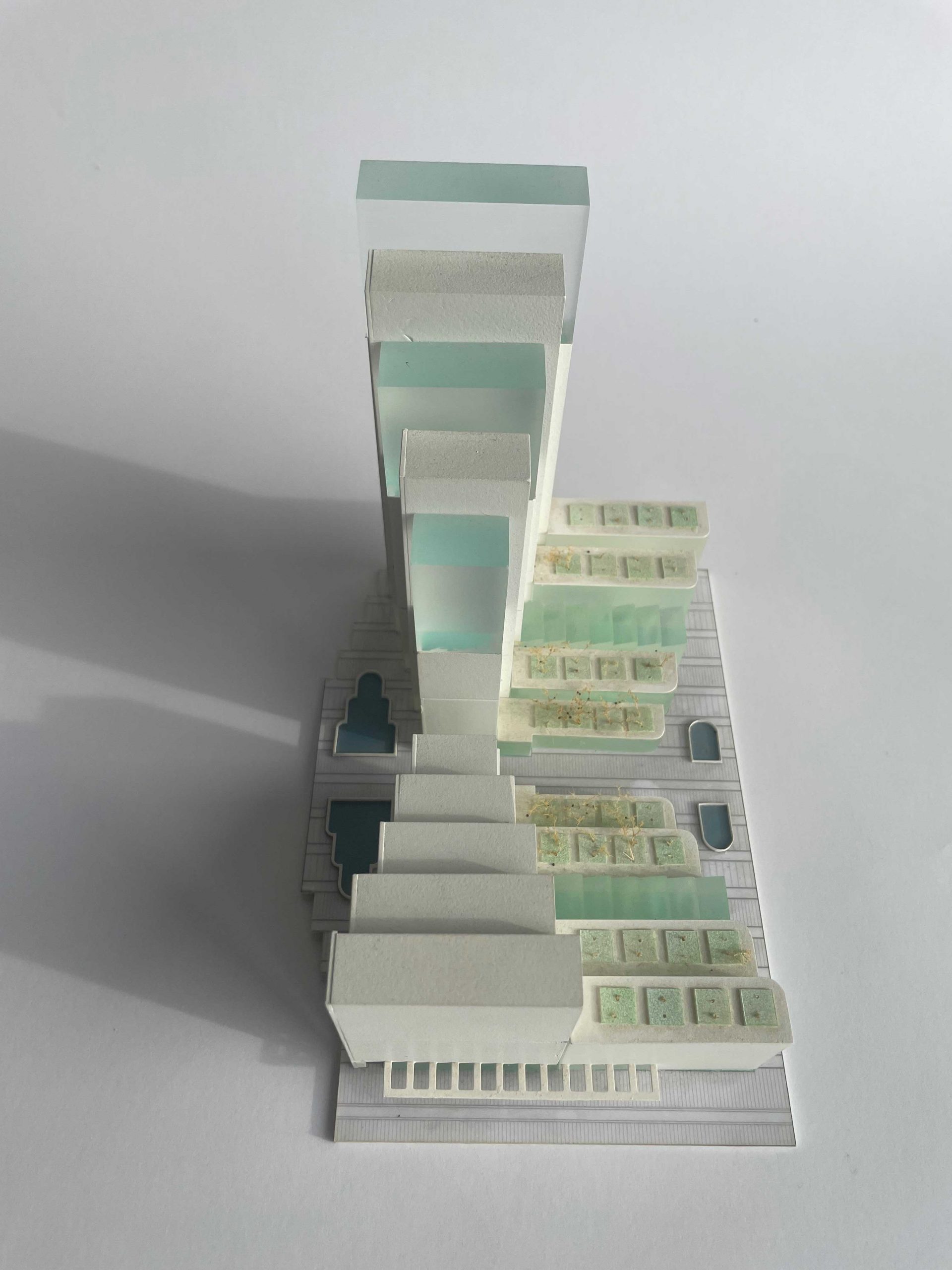 The program includes a mix of office spaces and residential units. The housing is concentrated in the northern tower, featuring generous south-facing terraces with views of the city. The lower volumes also include extensive rooftop terraces, planted with greenery to create a healthy urban microclimate. These green roofs not only enhance biodiversity but also provide social and environmental benefits. As such, the Tilburg Trade Center forms a powerful and sculptural edge to the new station square, while subtly and respectfully linking the area’s past to its future.