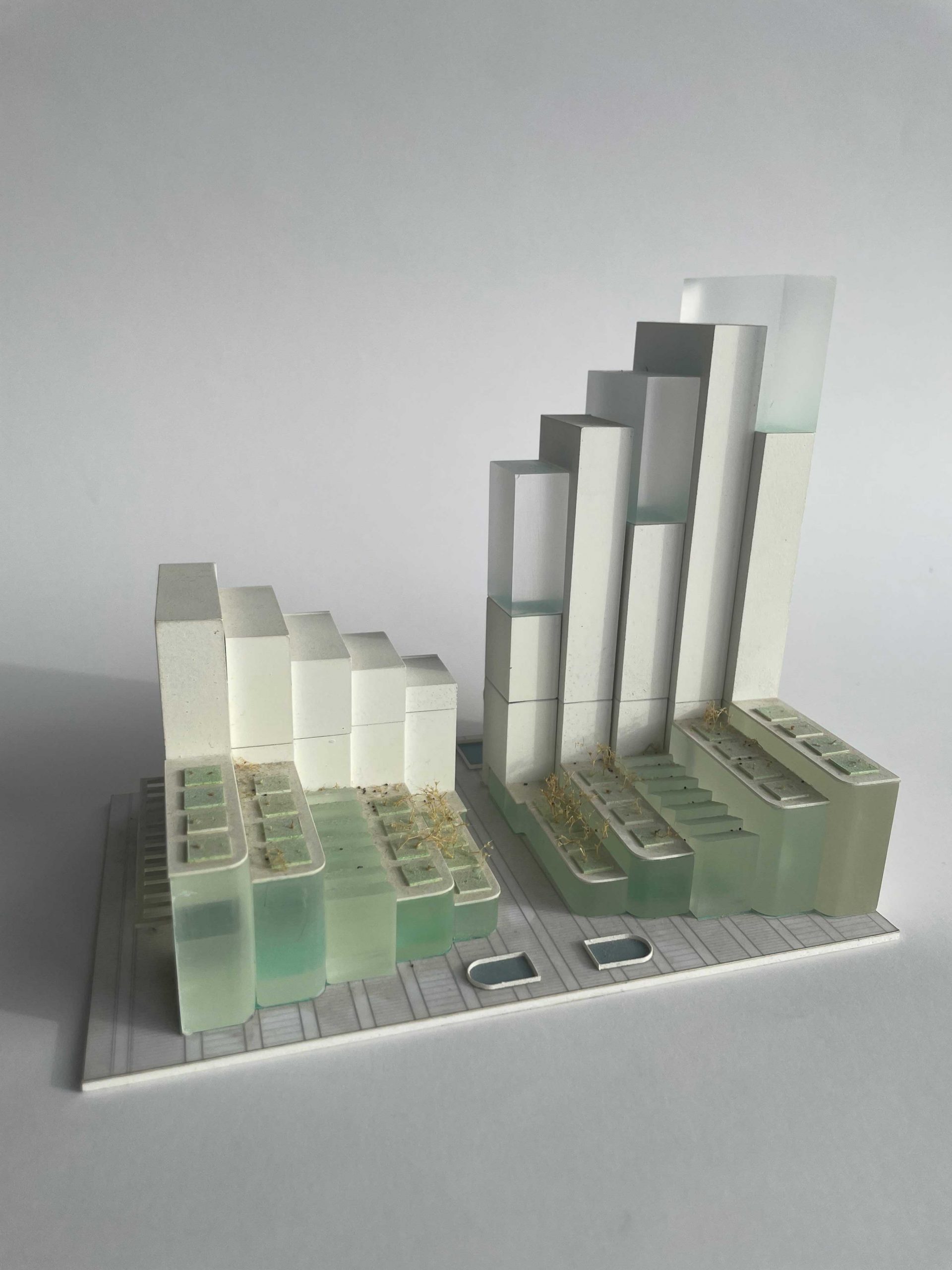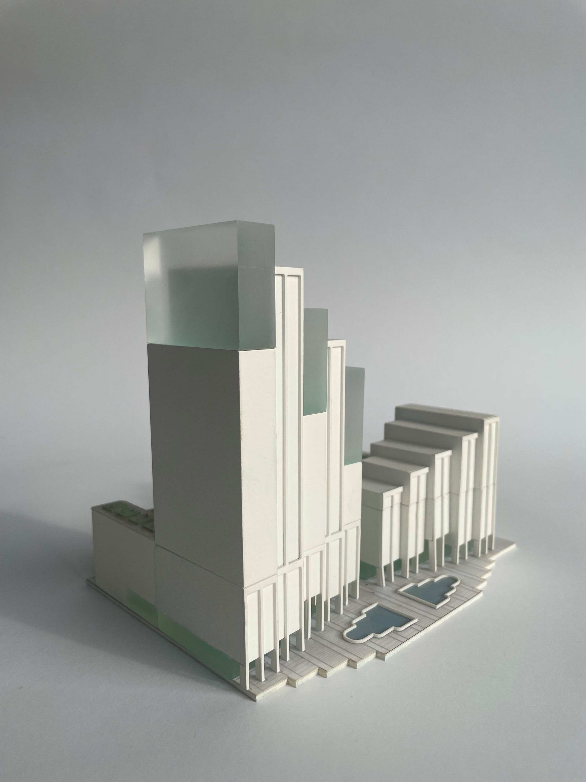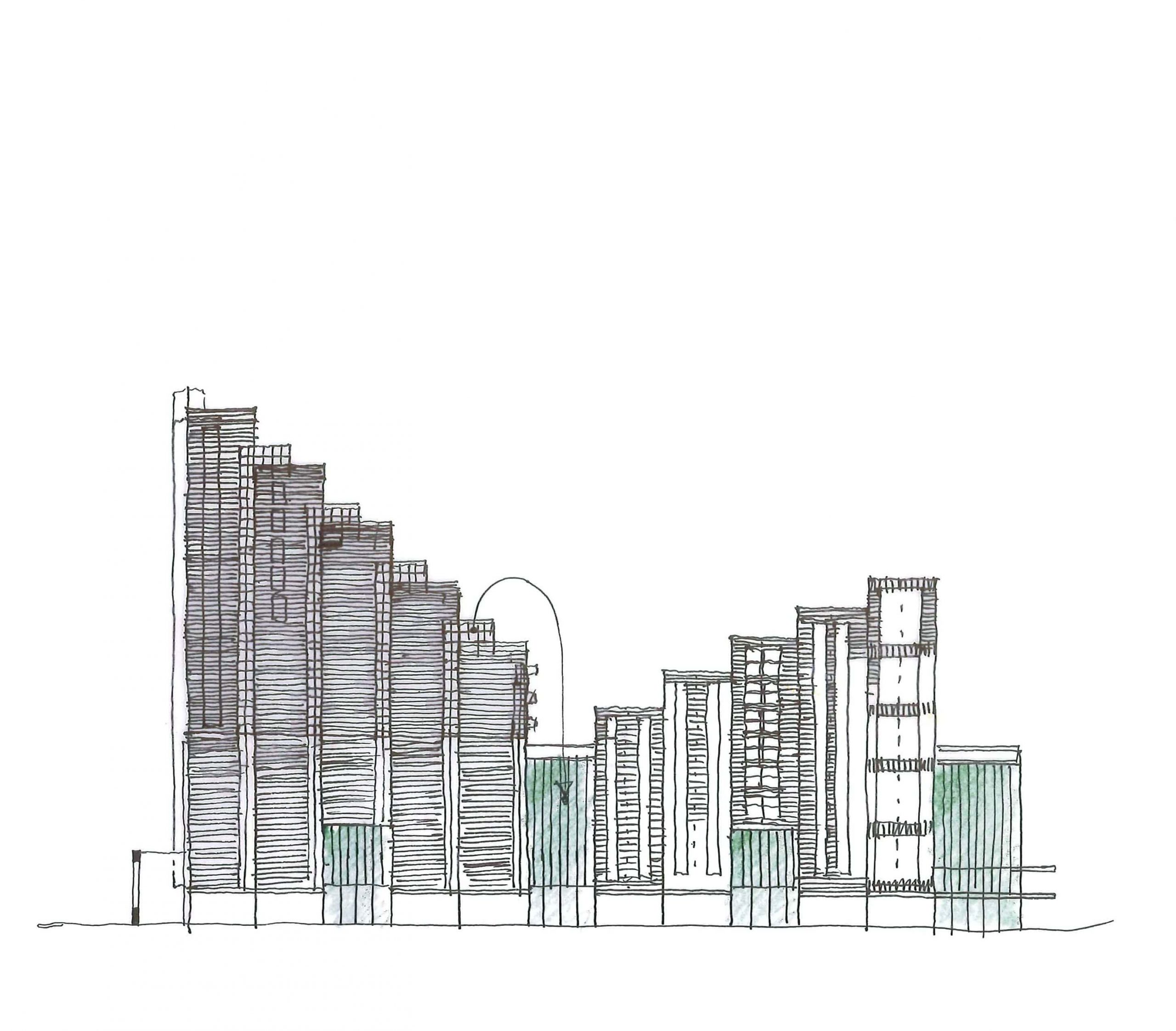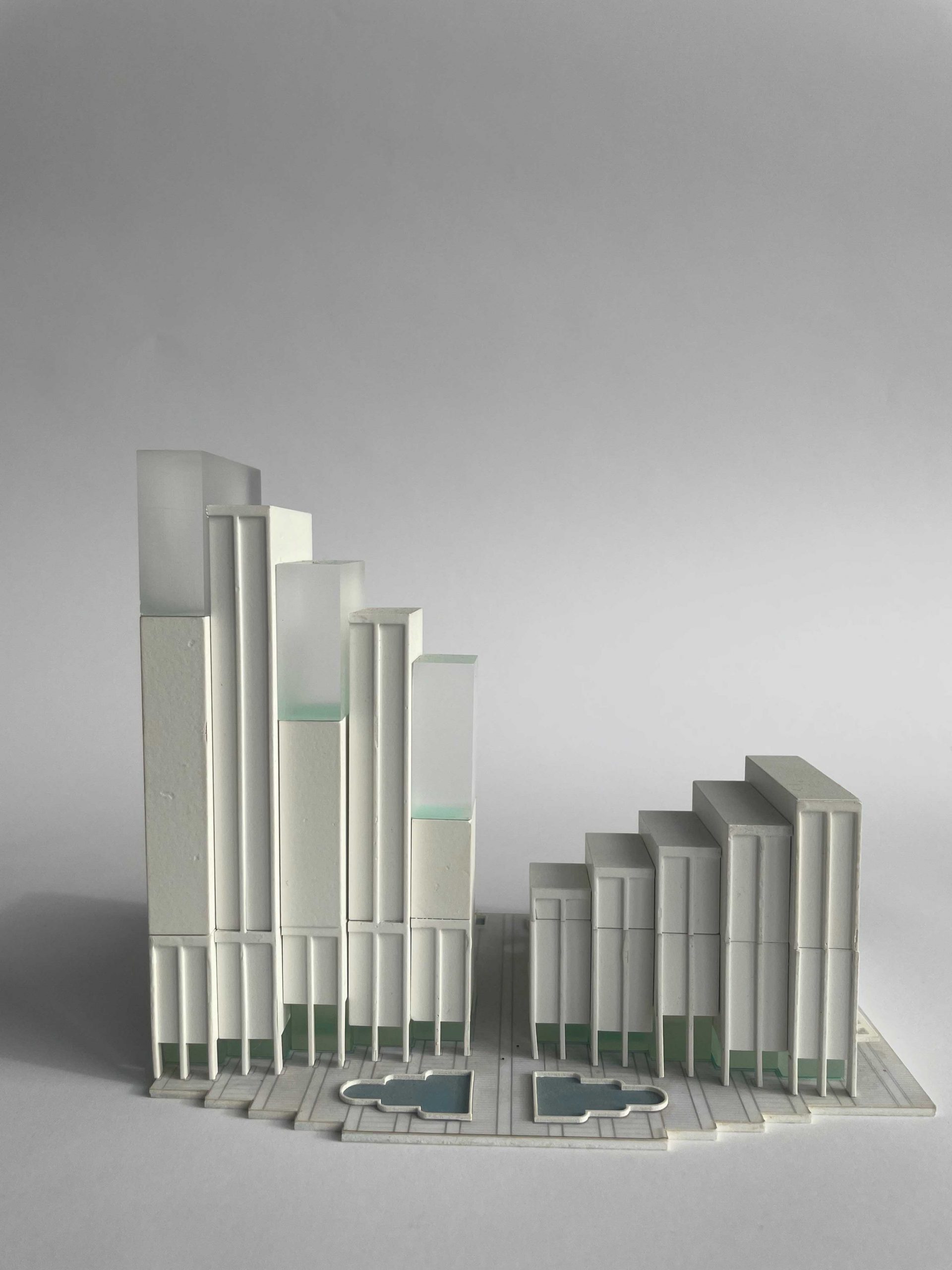 The volumes engage in a dialogue of form and rhythm. Together, they define an inviting concave facade along the square. The massing is composed in a stepped crescendo, rising toward the outer edges. The highest point is located at the northern end, marking the curve of the bajonet-shaped Burgemeester Brokxlaan, a key urban artery for the new district. The L-shaped cross-sections ensure that daylight continues to reach the LocHal, despite the increased urban density. The asymmetrical build-up and the consistent rhythm of facade setbacks give the ensemble a sculptural character. Together, the volumes resemble a kind of urban organ, theatrically framing the square, with a central visual axis pointing toward the LocHal.