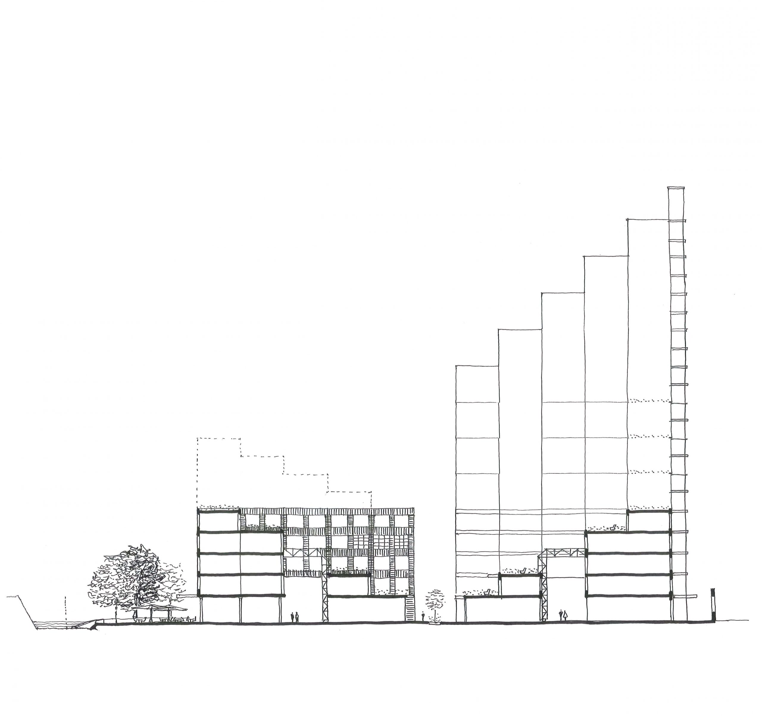 The site connects the bustling station square with the LocHal, a cultural and social hub of the city housing a public library, co-working spaces, and cafés. Two separate volumes flank a newly designed passage that leads from the square to an intimate courtyard between the TTC and the LocHal. This passage acts as a public connector and also provides a side entrance to the LocHal, strengthening pedestrian flow and activating the space throughout the day. On the LocHal side, the building line is intentionally set back, preserving views toward the historic structure from the station square.