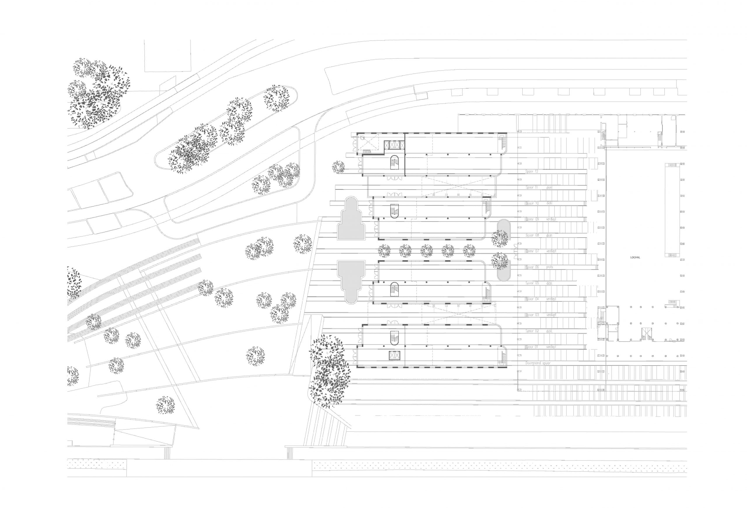 The orientation and positioning of the volumes are also informed by the historic railway structure. The former tracks that once led to the LocHal, formerly used for locomotive construction, are echoed in the layout. Some of these tracks are preserved and integrated into the passage and courtyard, serving as subtle historical references to the site’s industrial heritage.