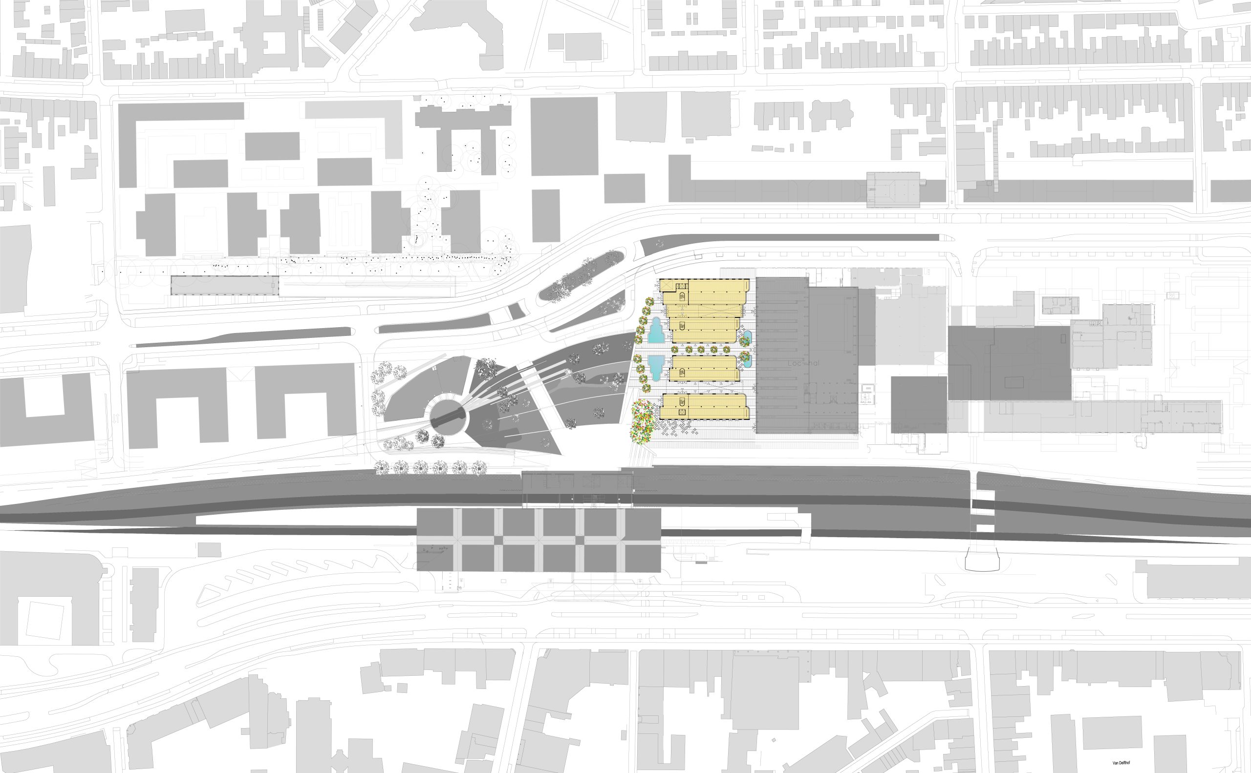 The closed competition for the Tilburg Trade Center (TTC) marks a crucial step in the transformation of the Spoorzone Tilburg, a former industrial site evolving into a vibrant urban district. Commissioned by Werkplaats Ontwikkelingsbedrijf B.V, a collaboration between the Municipality of Tilburg and VolkerWessels B.V, the brief called for a distinctive architectural ensemble on a prominent site at the new Burgemeester Stekelenburgplein, directly adjacent to Tilburg Central Station and the iconic LocHal.