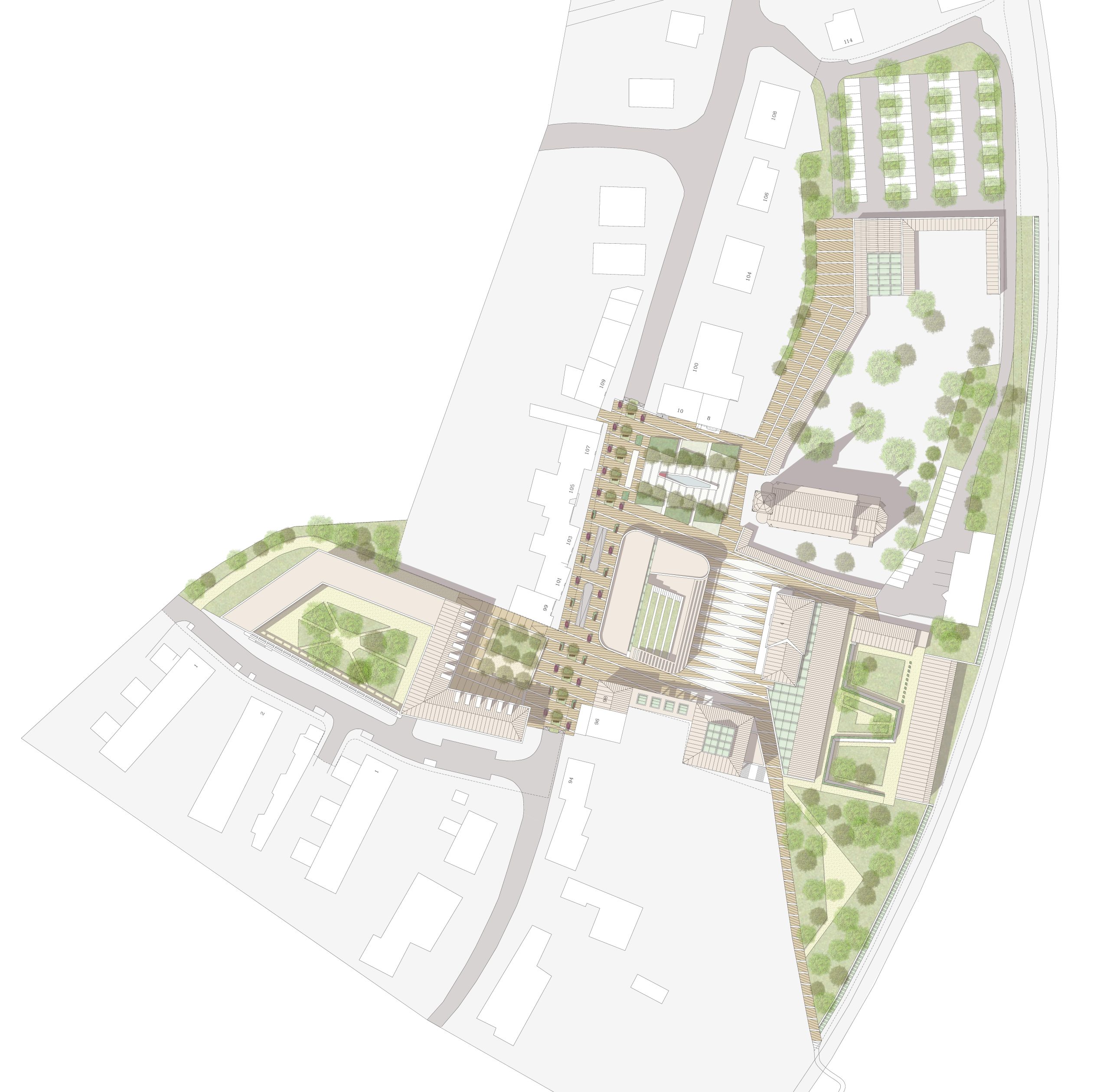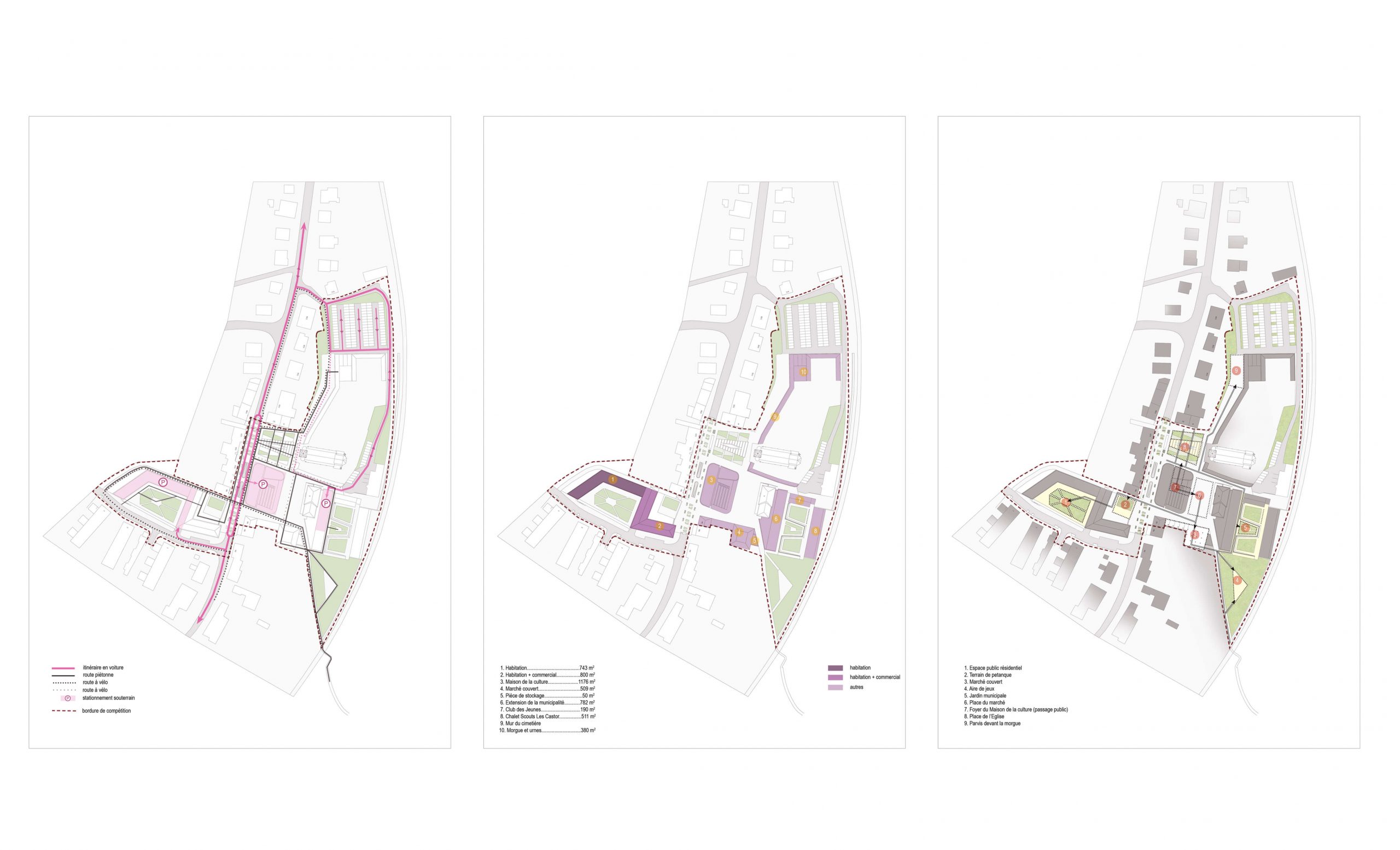 The masterplan for a new village center in Schuttrange was based on extensive research, consultations with local residents and thorough documentation of the existing situation. The competition we were part of in Luxembourg required the proposal of a new cultural center that would fit and connect to the urban tissue and the existing choreography of this masterplan, but also revitalize the area by bringing a new atmosphere and a new way of approaching the surroundings. Our main philosophy was to emphasize the profound interplay between the built environment and public spaces, creating a balanced relationship between architecture and environmental sustainability. We placed the new cultural building in a strategic way that would automatically help in creating three main public squares: 1.Place du Marche, 2.Place de l’Eglise, 3.Place Hannert Thommes, free of car traffic, designed for pedestrians that serve as meeting and connection points. The square in front of the market, Place du Marche, has a more open and functional character, free of street furniture making it more eligible to be used for market purposes and other events, while the square in front of the church, Place de l’Eglise, has a more intimate scale framed by green zones in a slope, planted with grass, block hedges, and characteristic red trees of the area creating this way a landscaped open space for gatherings and interconnection. And the third square, Place Hannert Thommes, has a more residential character, slightly elevated from the street providing a buffer and meeting point for the residents, enhancing this way the quality of the space and the harmonic communication with the other public spaces. The rue principal is transformed into a 30km/h zone covered meticulously from the special paving that is used for the public squares, as a wrapping mantle that connects the interacting areas, making the cars ‘guests’ in the pedestrian zone. Six new buildings are added in the plan area: an L-shaped residential building, the market hall, the cultural center, an extension to the town hall, the Scout Chalet and the cemetery walls with a mortuary. All buildings try to merge and adapt to the traditional style of the surroundings in line with the Luxembourgish architectural traditions, except for the cultural center which embodies a more contemporary style in combination with tones and materials that harmonize with the existing architecture. The soft rounded corners of the cultural center, connect the new squares in a supple way. Our aim is to make our design part of the urban tissue in the most natural way possible, without imposing its presence, and giving priority to the human circulation in the built environment